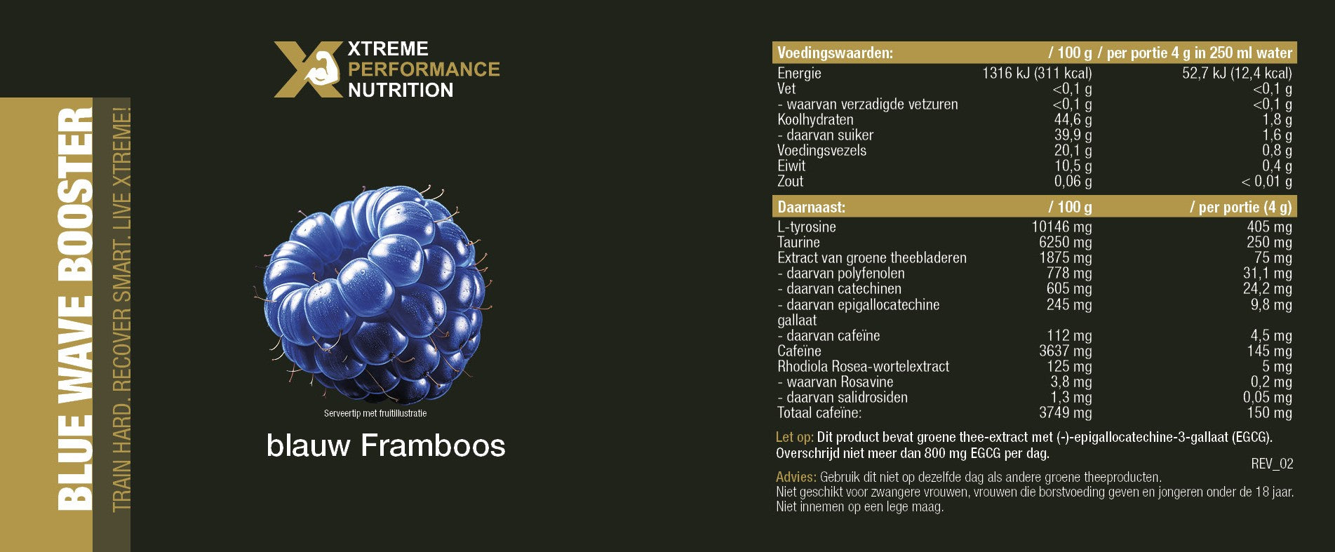- 150 mg Cafeïne per portie (300 mg bij dubbele dosering)